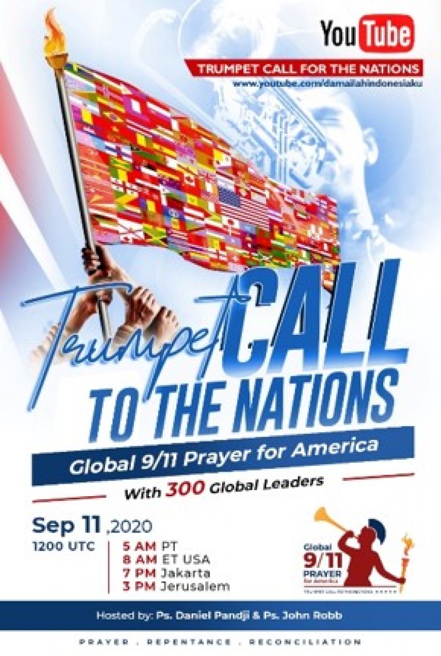 On September 11th, Indonesian and American prayer leaders co-hosted a global online prayer call via YouTube called “Trumpet Call to the Nations: Global 9/11 Prayer for America”. You can see the full video on this link https://youtu.be/F7pmkOXhBSs It begins with a moving video called “Praying for America”, a splendid aerial video of the country set to the lovely, worshipful music “As One We Stand” by Terry and Barbi Franklin who are both worship leaders and intercessors. (That video has since been adapted for churches and prayer groups to use as a prayer video with specific concerns for the nation now and is attached below for your use.)
