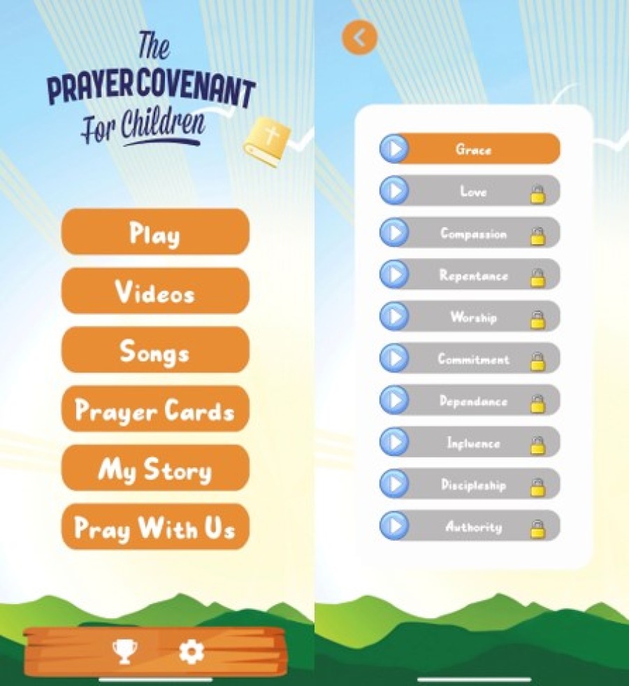 Play contains interactive, reward-based activities to motivate children to learn all ten of The Prayer Covenant themes (Grace, Love, Compassion, Repentance, Worship, Commitment, Dependence, Influence, Discipleship, and Authority). The activities begin with the first theme and the rest unlock one by one as they are completed, working their way through the tenth lesson on Authority.