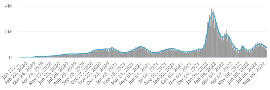 The following table charts the worldwide 7-day average of cases over the course of the pandemic.